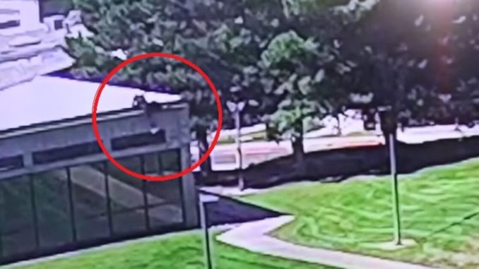 Surveillance video showing the suspect fleeing the scene after the shooting at Utah Valley University. This footage captures the individual jumping from a rooftop and running toward a wooded area.