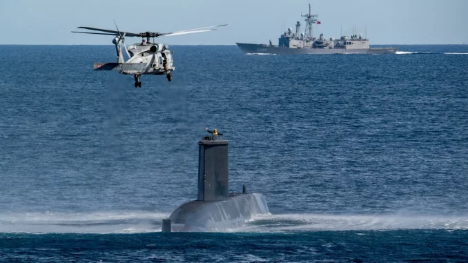 FILE – A Turkish navy helicopter, ship and submarine take part in a warfare exercise off the coast of Catania, Sicily, southern Italy, Monday, Feb. 26, 2024. (AP Photo/Salvatore Cavalli, File)