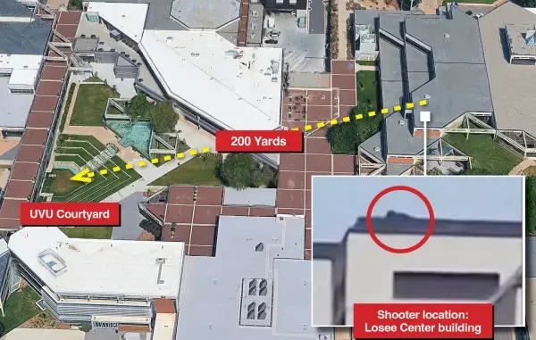 A drone shows the reported location of the shooter on a rooftop, at the scene where Charlie Kirk was fatally shot during an event at Utah Valley University.
