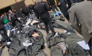 This frame grab from videos taken fron Jan. 9-11,2026 and circulating on social media purportedly shows images from a morgue with dozens of bodies and mourners after crackdown on the outskirts of Iran’s capital in Kahrizak, Tehran Province