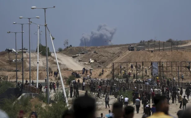 Smoke rises following an Israeli bombardment in Gaza, as seen from a humanitarian aid distribution center, in Khan Younis, Gaza Strip, on May 29, 2025. Abdel Kareem Hana/AP