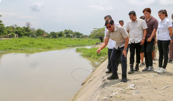 President Ferdinand Marcos Jr., together with DOTr Secretary Vince Dizon, Bulacan Governor Daniel Fernando, and other officials, inspects the ₱77.1-million flood mitigation structure in Barangay Frances, Calumpit, Bulacan. Mark Balmores, PPA pool/File