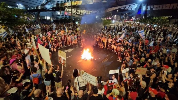 Protesters light a bonfire on Tel Aviv’s Begin Road as they call for the release of Hamas-held hostages in Gaza, August 16, 2025. (Aviv Hassidov / Pro-Democracy Protest Movement)