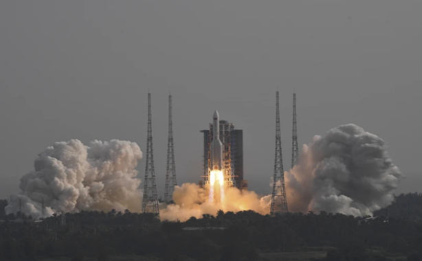 In this photo released by Xinhua News Agency, the Long March-5B Y4 carrier rocket carrying the space lab module Mengtian blasts off from the Wenchang Satellite Launch Center in south China’s Hainan Province on Oct. 31, 2022. (Hu Zhixuan/Xinhua via AP, File)