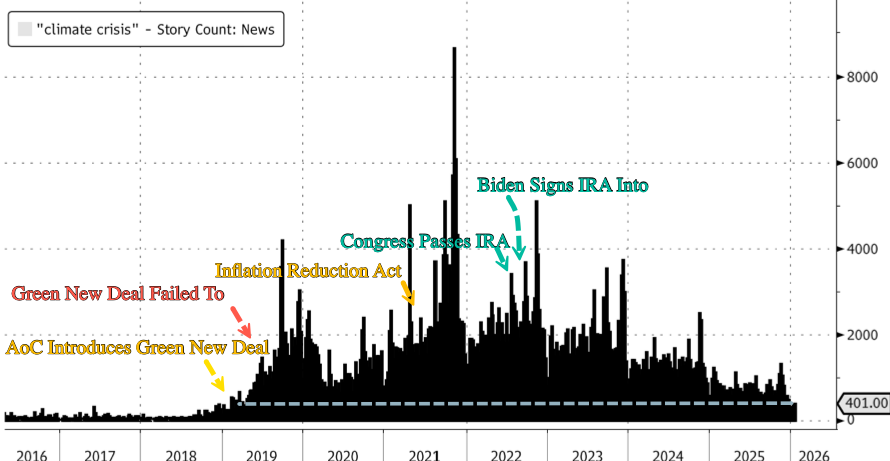 Bloomberg data shows that once the climate bill passed and taxpayer money flooded green energy companies and activist NGOs by the tens of billions, the constant “world on fire” rhetoric suddenly cooled off. When the funding arrived, the panic vanished.